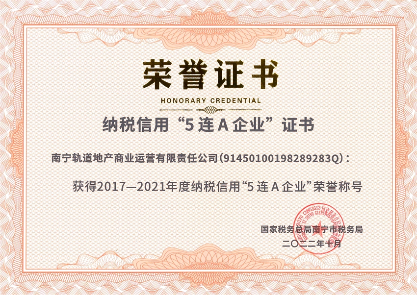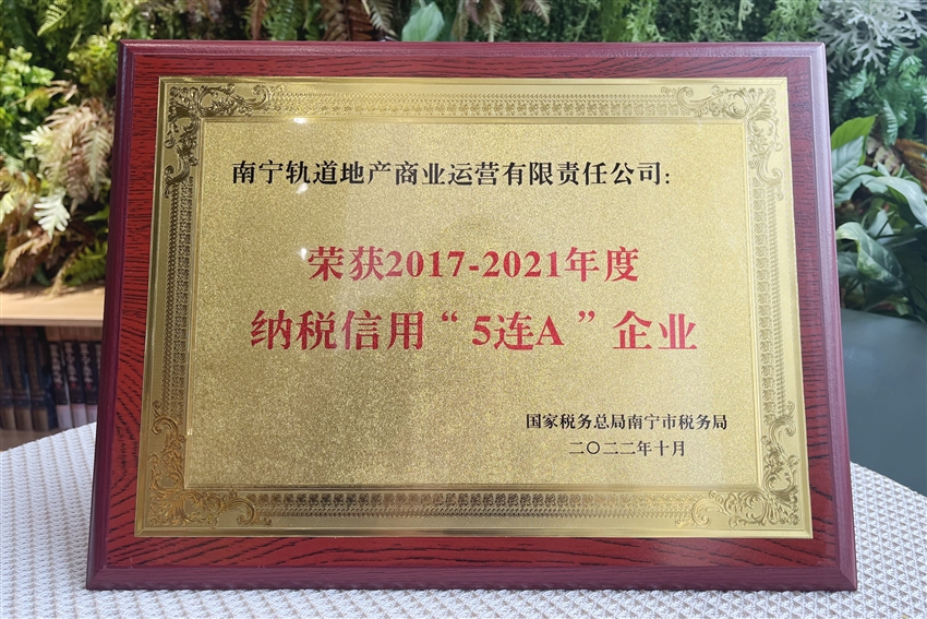 近日,軌道地產(chǎn)商業(yè)公司榮獲國家稅務(wù)總局南寧市稅務(wù)局授予的納稅信用“5連A”企業(yè)榮譽稱號。獲此殊榮,不僅是稅務(wù)機關(guān)對軌道地產(chǎn)商業(yè)公司稅務(wù)管理工作的充分肯定,更為軌道地產(chǎn)商業(yè)公司走高質(zhì)量發(fā)展之路提供了強有力的支撐。